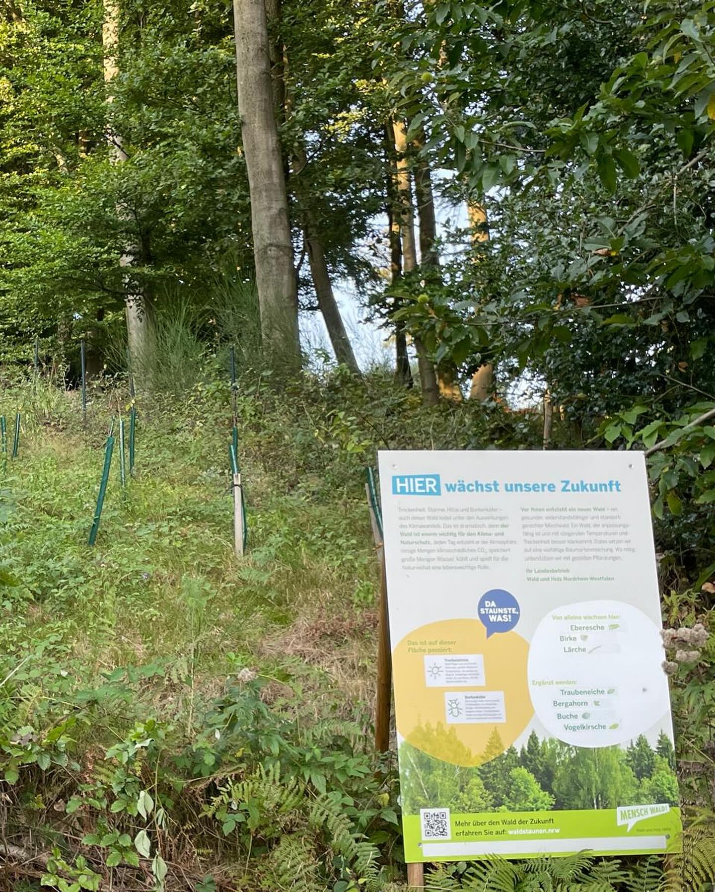 Auf den bereitgestellten Bildern sehen Sie die neu aufgeforsteten Flächen sowie eine Informationstafel, die das Projekt und seine Ziele näher erläutert. Diese Tafel bietet auch interessierten Bürgerinnen und Bürgern die Möglichkeit, sich über den Fortschritt und die geplanten weiteren Maßnahmen zu informieren.